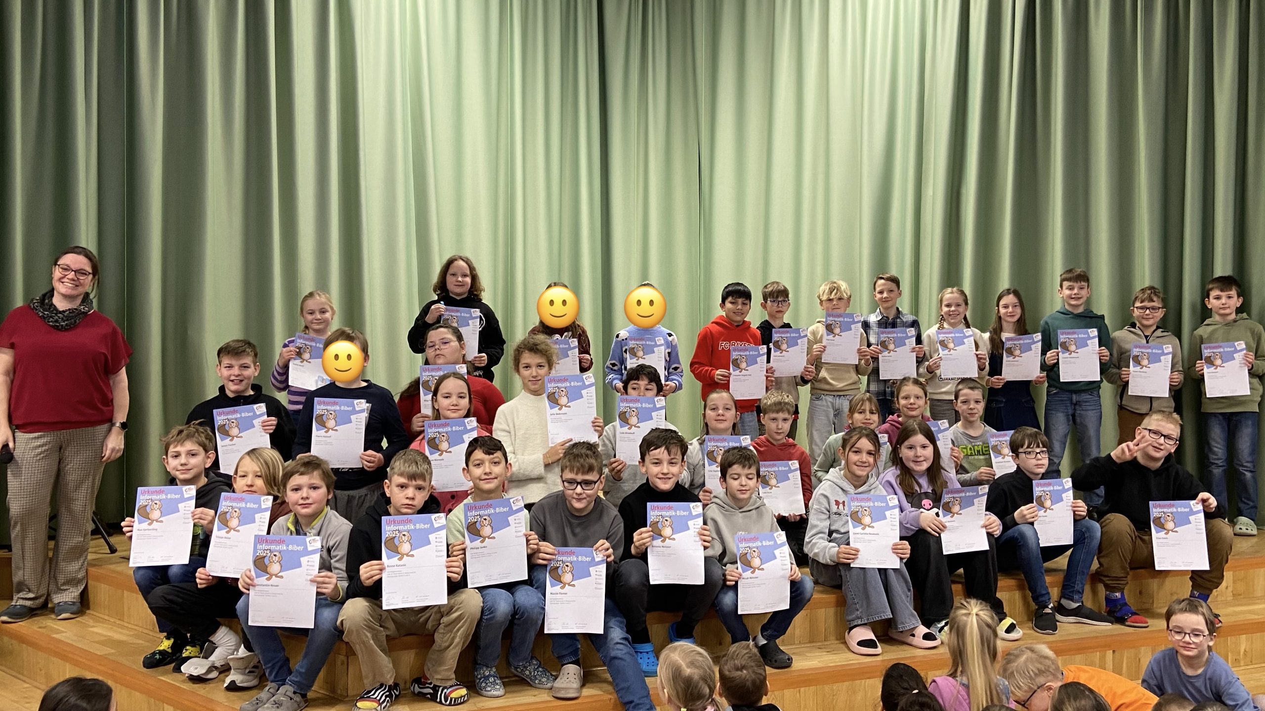 Große Freude herrschte am 30. Januar in der Aula der Grundschule Oldau: Auch in diesem Schuljahr haben einige Schülerinnen und Schüler der dritten und vierten Klassen erfolgreich am Informatik-Biber teilgenommen und dabei hervorragende Leistungen erzielt. Besonders stolz sind wir auf die Erst-, Zweit- und Drittplatzierten, die nun im Rahmen einer kleinen Ehrung ausgezeichnet wurden.