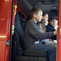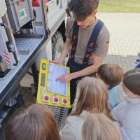 Im Anschluss wurden die Feuerwehrfahrzeuge genau unter die Lupe genommen. Die Kinder erfuhren viel über die verschiedenen Geräte, Werkzeuge und deren Einsatzmöglichkeiten. Viele staunten darüber, wie viel Technik in einem einzigen Fahrzeug steckt und wie gut alles organisiert ist. Danach durften alle Kinder in die Feuerwehrautos einsteigen und Platz nehmen – ein aufregendes Erlebnis! Auch das Martinshorn und das Blaulicht wurden erklärt und sorgten für leuchtende Augen und große Begeisterung.