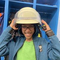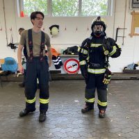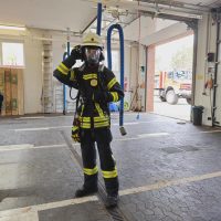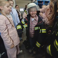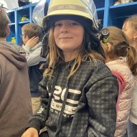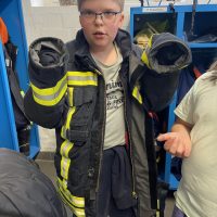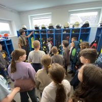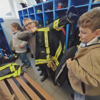 Danach ging es in die Umkleideräume der Feuerwehr. Ein echtes Highlight war es, Helme und Einsatzjacken anzuprobieren und einmal selbst zu spüren, wie schwer die Ausrüstung ist. Besonders beeindruckend war der Moment, als ein Feuerwehrmann vollständig seine Einsatzkleidung trug und die Kinder die einzelnen Ausrüstungsgegenstände benennen durften.