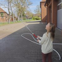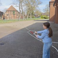 Je nach Wetter konnten einige Klassen außerdem selbst aktiv werden und mit dem Feuerwehrschlauch erste Übungen durchführen.
