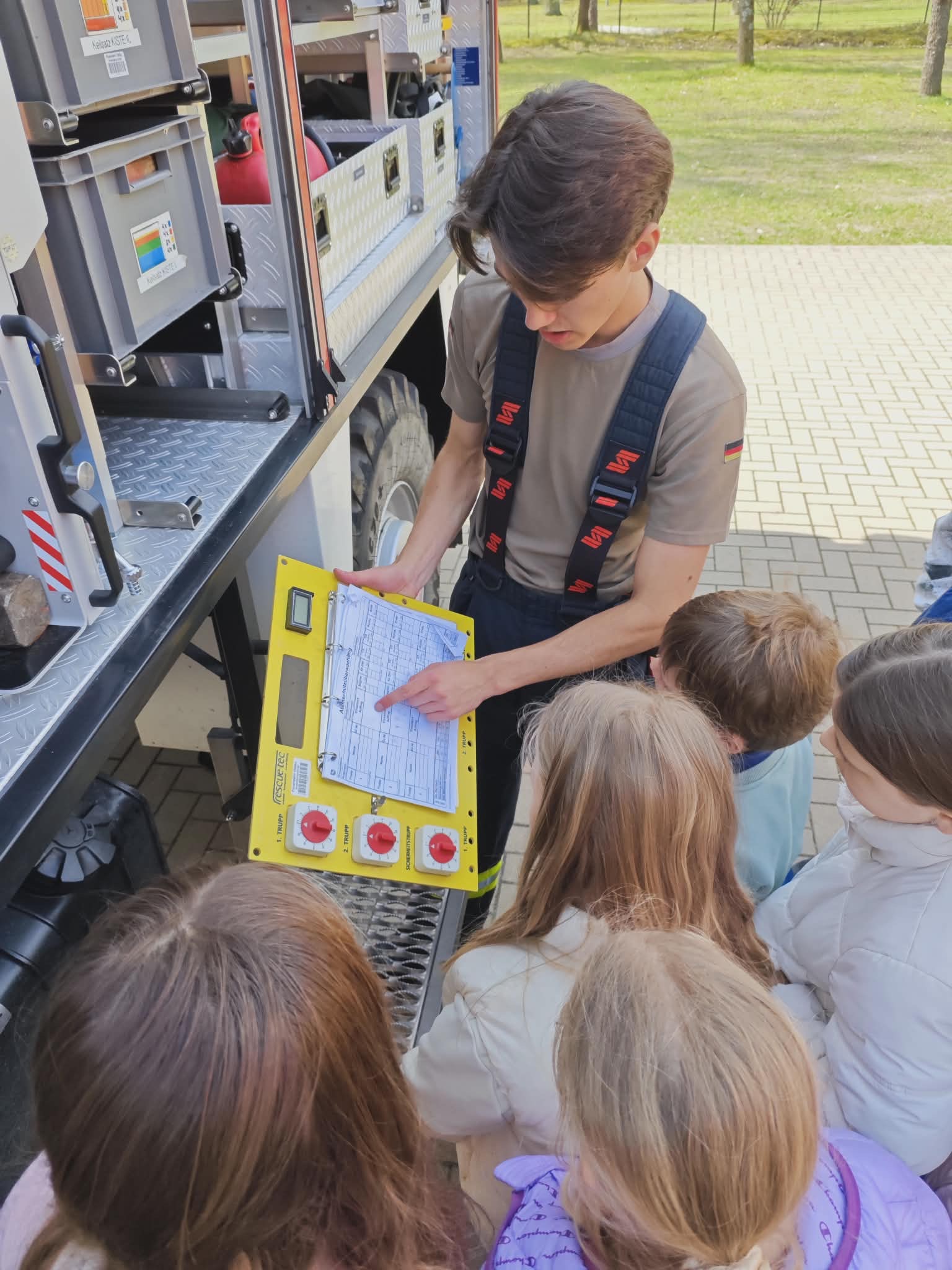 Im Anschluss wurden die Feuerwehrfahrzeuge genau unter die Lupe genommen. Die Kinder erfuhren viel über die verschiedenen Geräte, Werkzeuge und deren Einsatzmöglichkeiten. Viele staunten darüber, wie viel Technik in einem einzigen Fahrzeug steckt und wie gut alles organisiert ist. Danach durften alle Kinder in die Feuerwehrautos einsteigen und Platz nehmen – ein aufregendes Erlebnis! Auch das Martinshorn und das Blaulicht wurden erklärt und sorgten für leuchtende Augen und große Begeisterung.