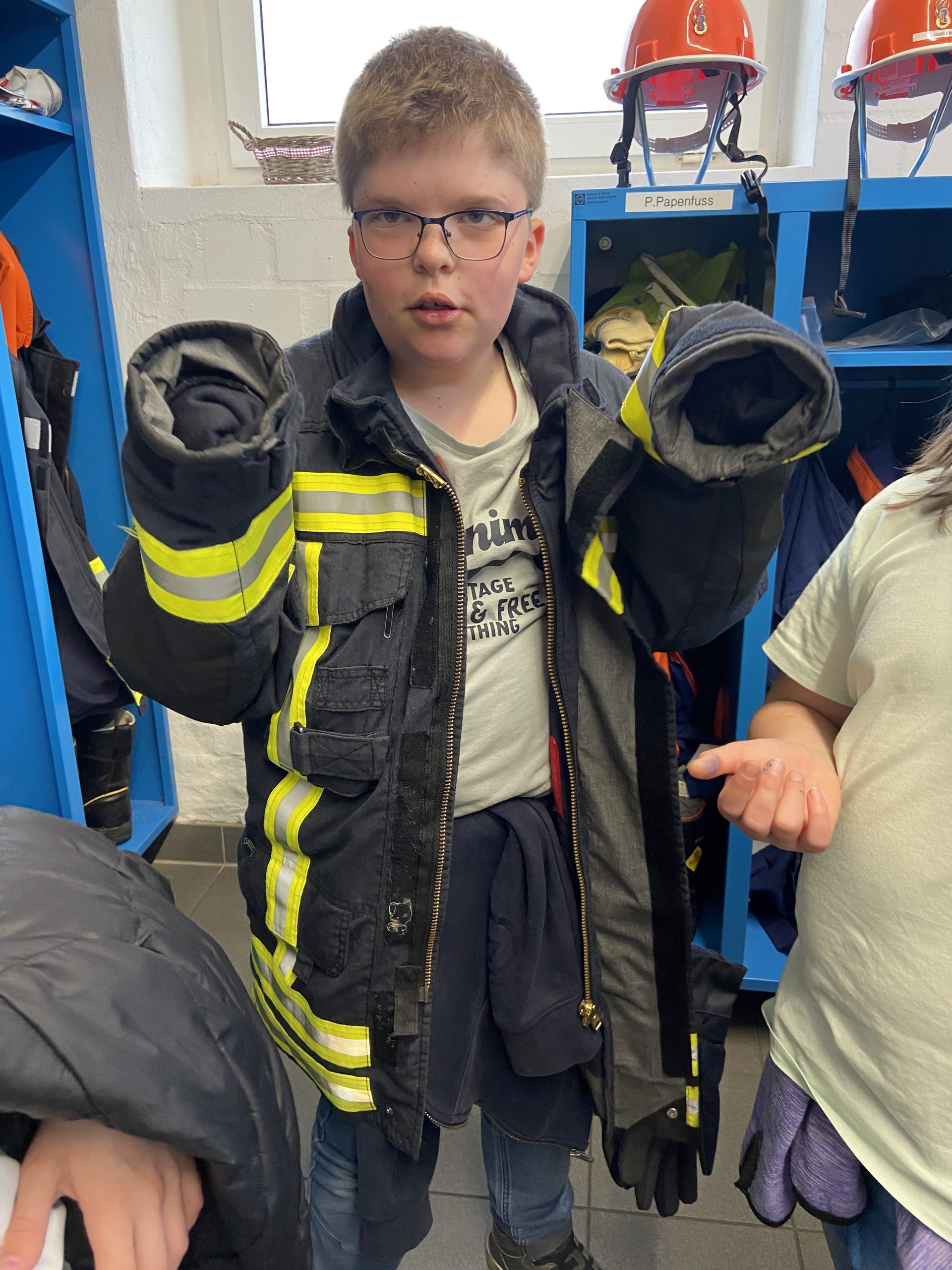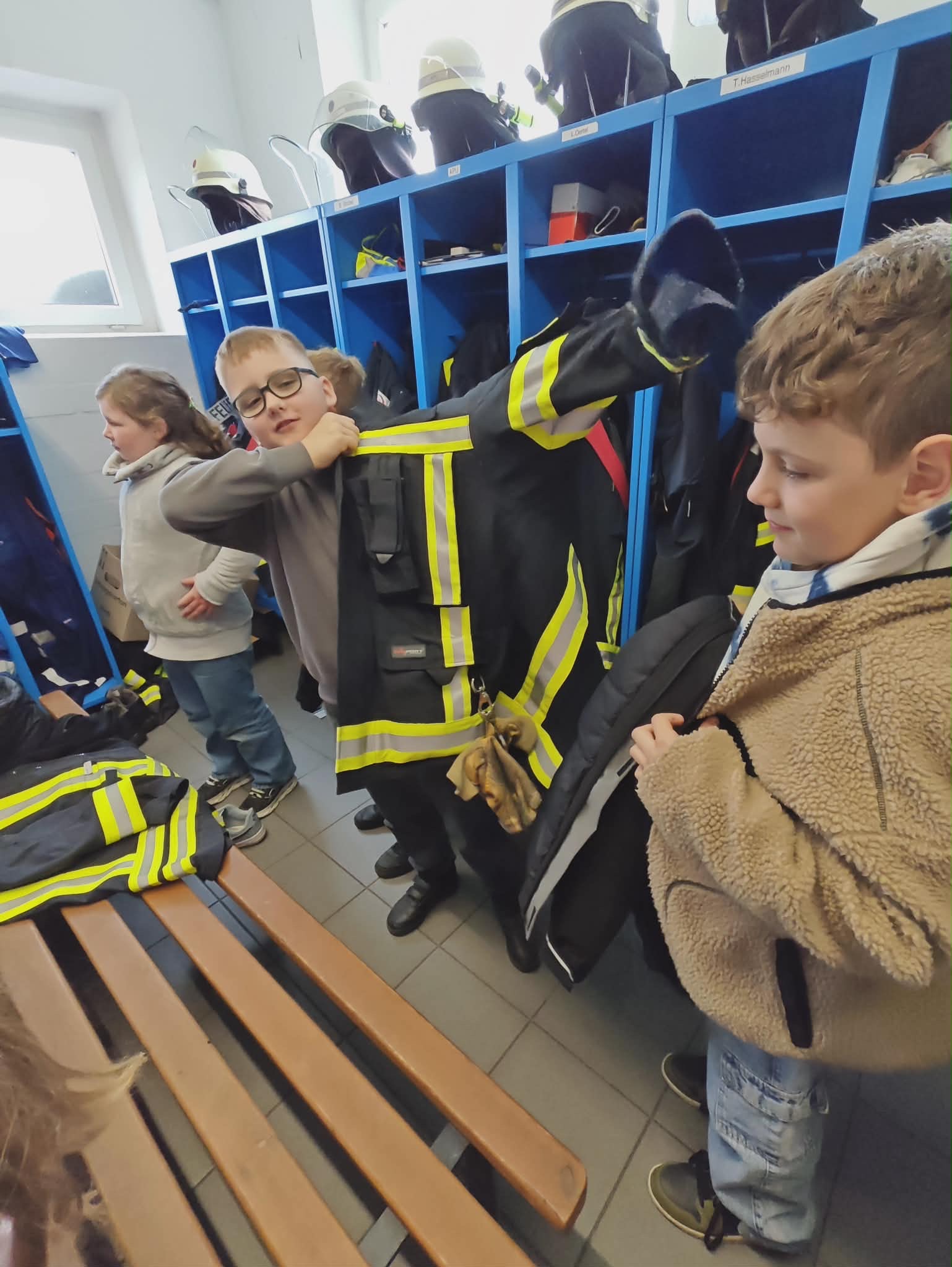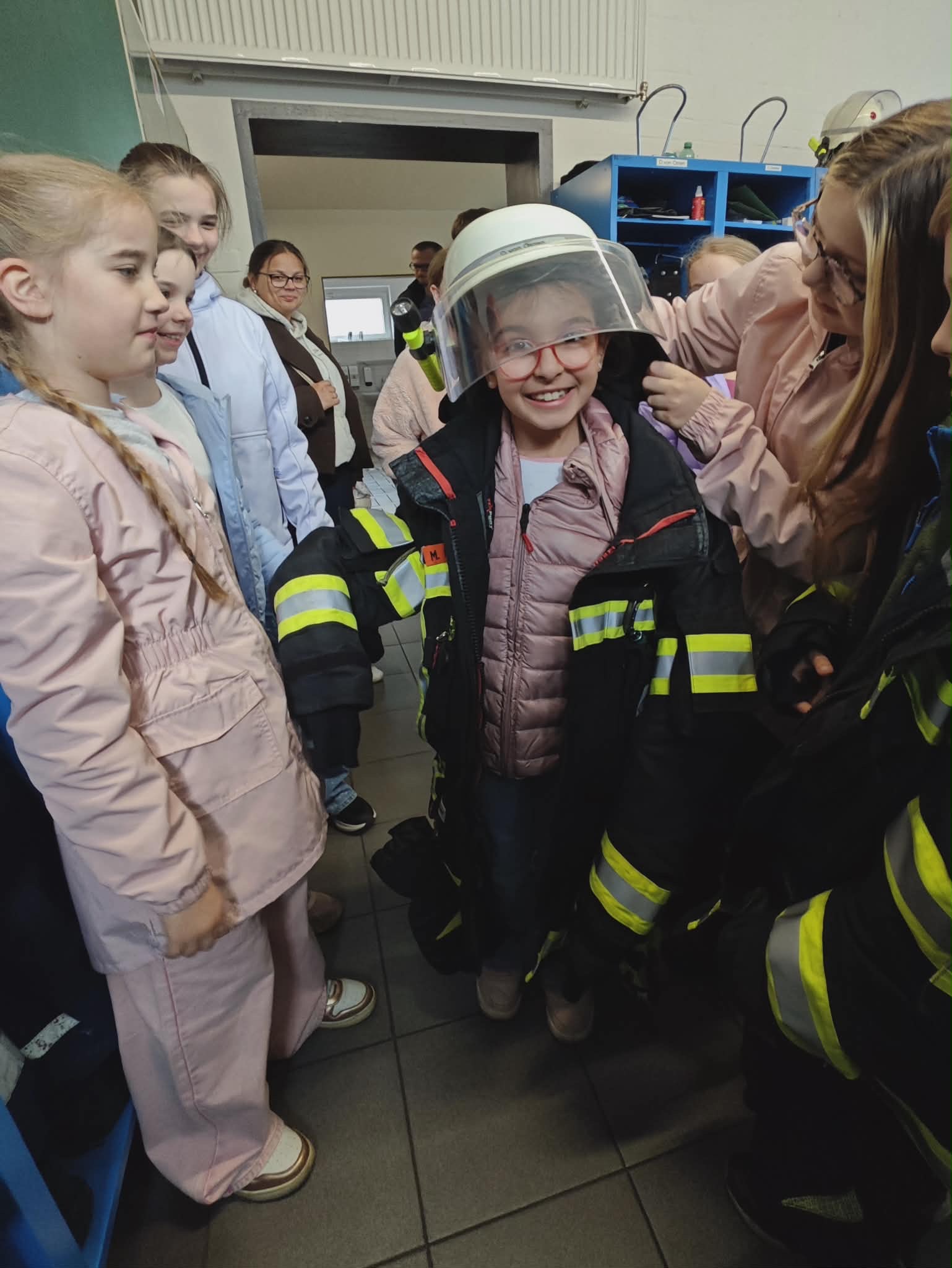 Danach ging es in die Umkleideräume der Feuerwehr. Ein echtes Highlight war es, Helme und Einsatzjacken anzuprobieren und einmal selbst zu spüren, wie schwer die Ausrüstung ist. Besonders beeindruckend war der Moment, als ein Feuerwehrmann vollständig seine Einsatzkleidung trug und die Kinder die einzelnen Ausrüstungsgegenstände benennen durften.