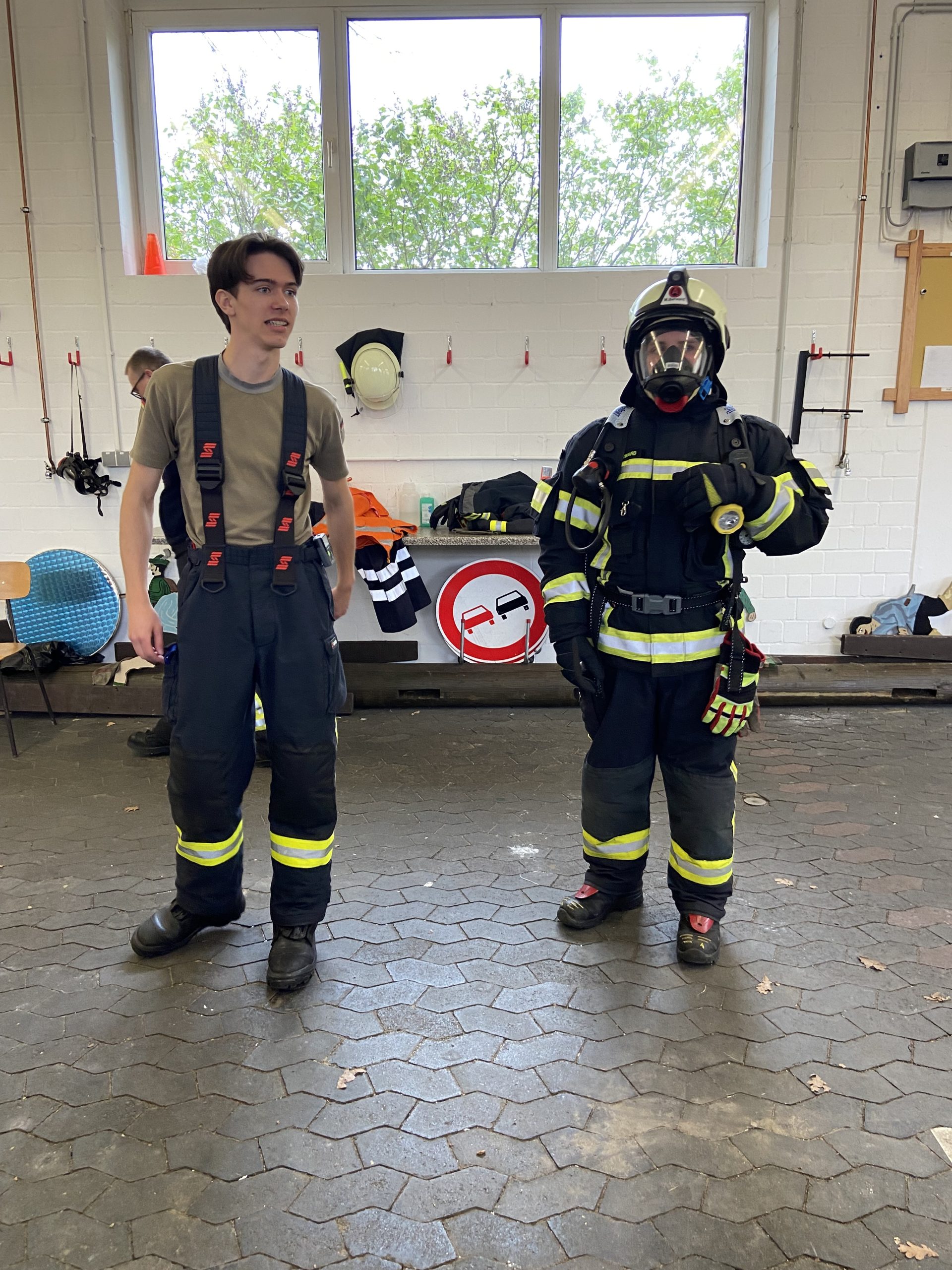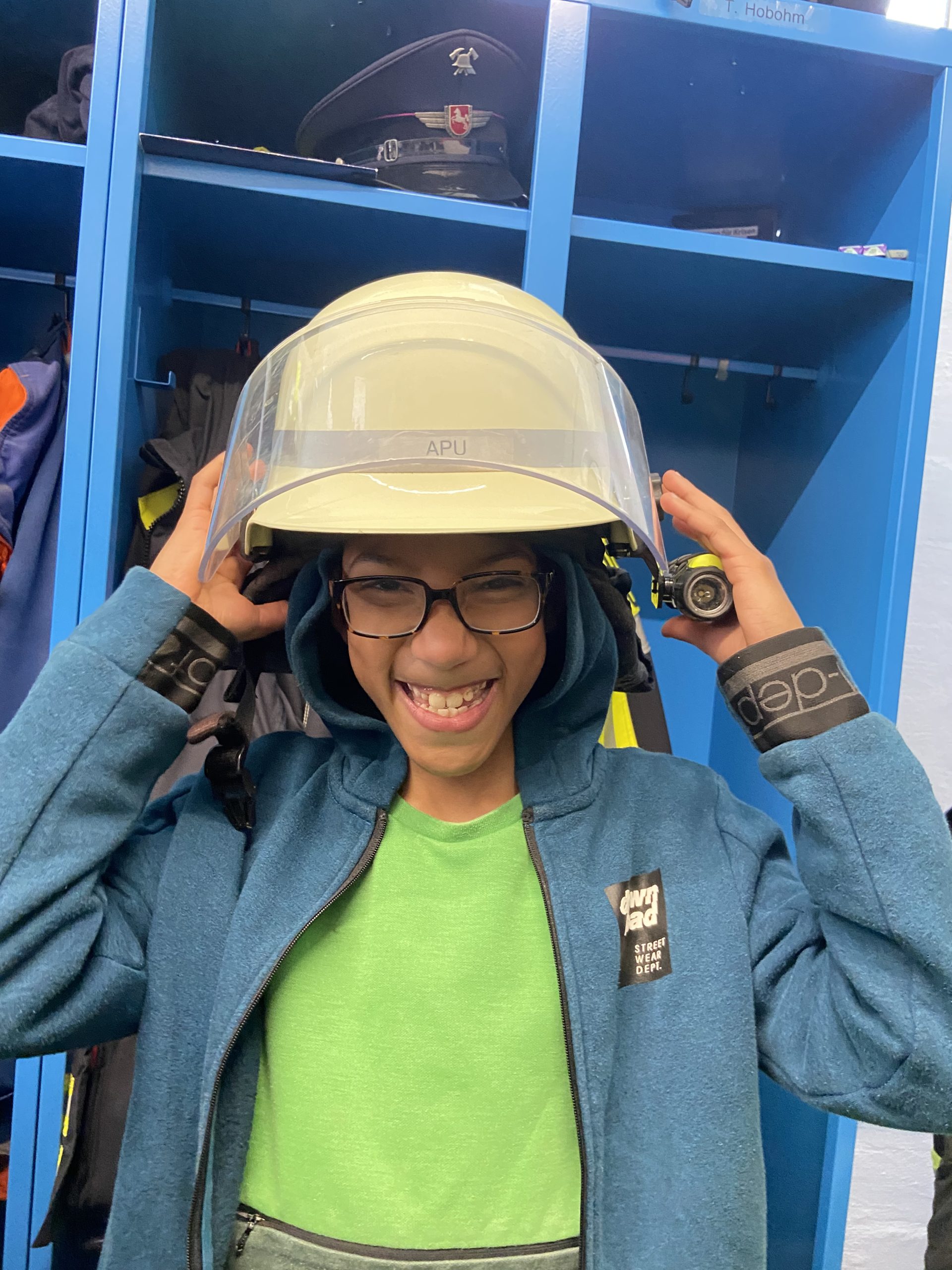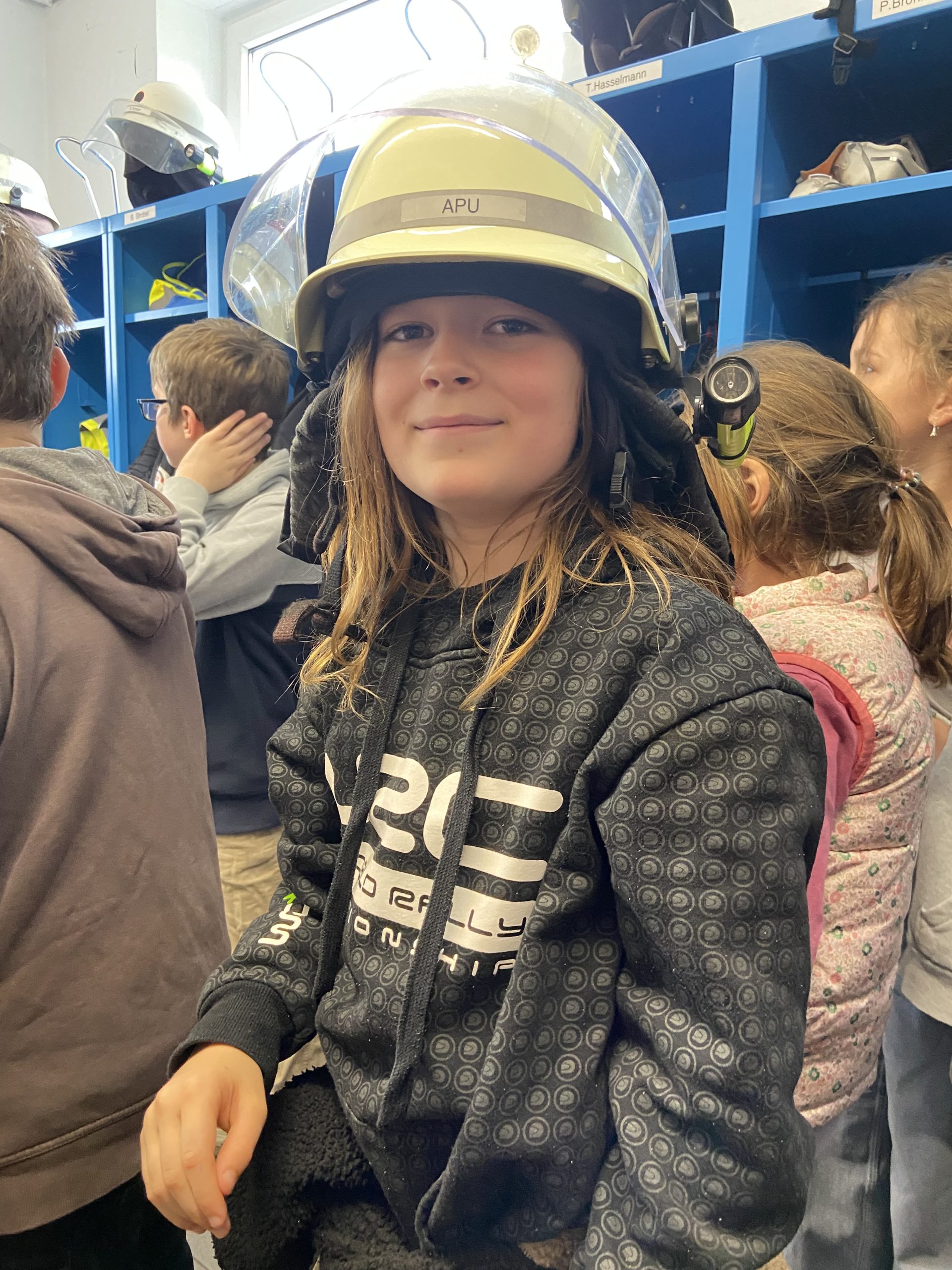 Danach ging es in die Umkleideräume der Feuerwehr. Ein echtes Highlight war es, Helme und Einsatzjacken anzuprobieren und einmal selbst zu spüren, wie schwer die Ausrüstung ist. Besonders beeindruckend war der Moment, als ein Feuerwehrmann vollständig seine Einsatzkleidung trug und die Kinder die einzelnen Ausrüstungsgegenstände benennen durften.