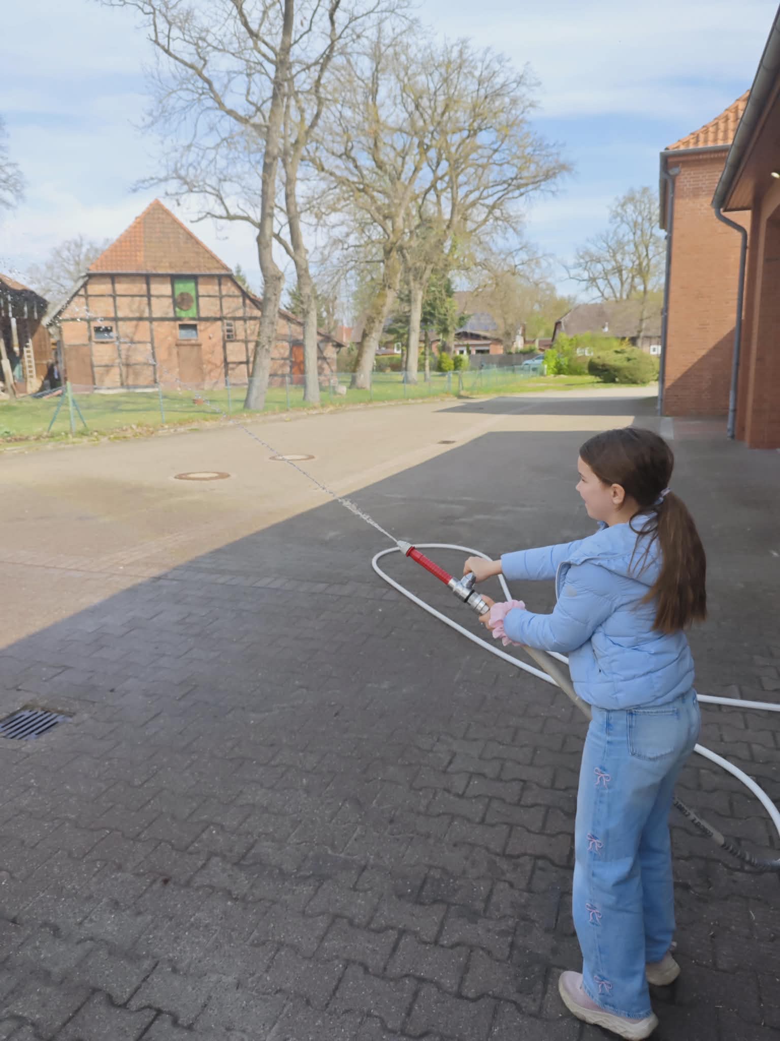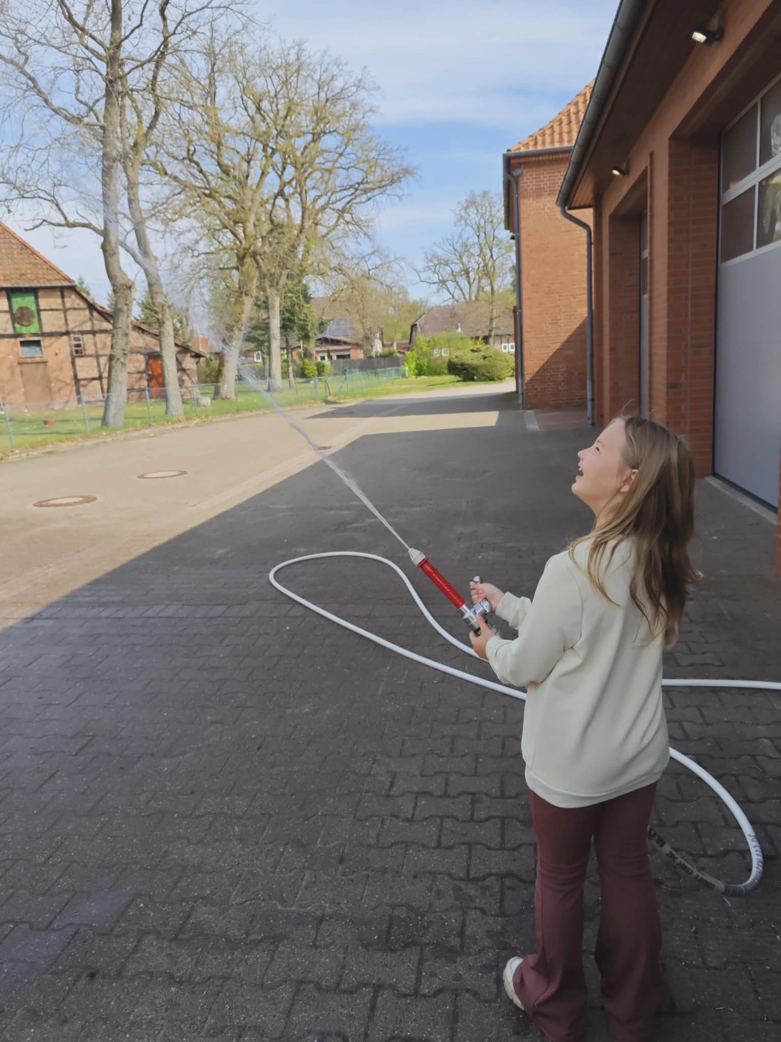 Je nach Wetter konnten einige Klassen außerdem selbst aktiv werden und mit dem Feuerwehrschlauch erste Übungen durchführen.