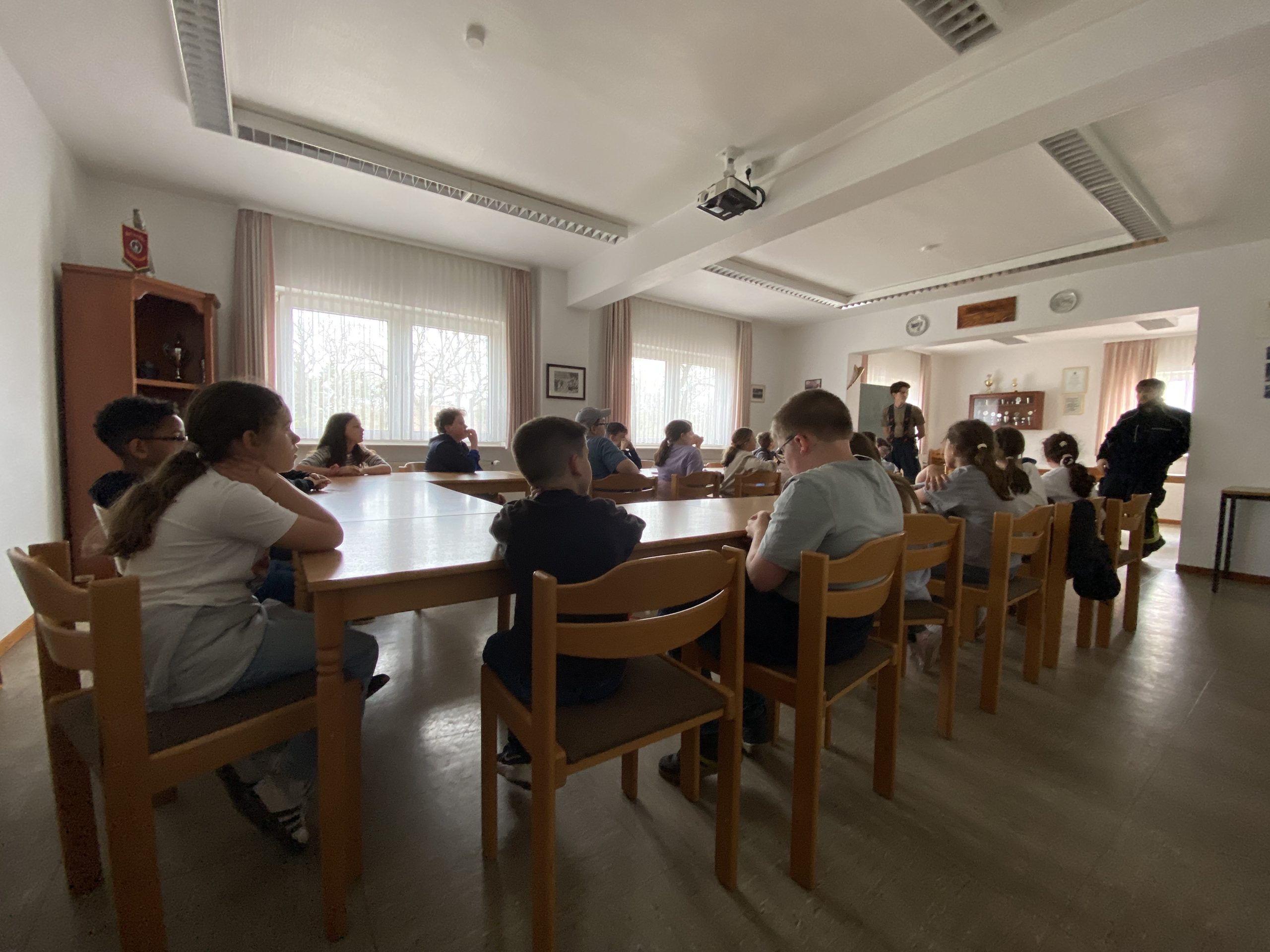 An der Feuerwache angekommen wurden die Kinder herzlich von Henning Sonnenschmidt, Meik Rißmann und Marvin Barward empfangen und begrüßt. Im Schulungsraum durften die Kinder ihr bereits erworbenes Wissen rund um das Thema Feuerwehr zeigen und erzählen, was sie schon alles gelernt hatten. Es war schön zu sehen, wie viel die Kinder schon wussten und wie begeistert sie sich beteiligten.