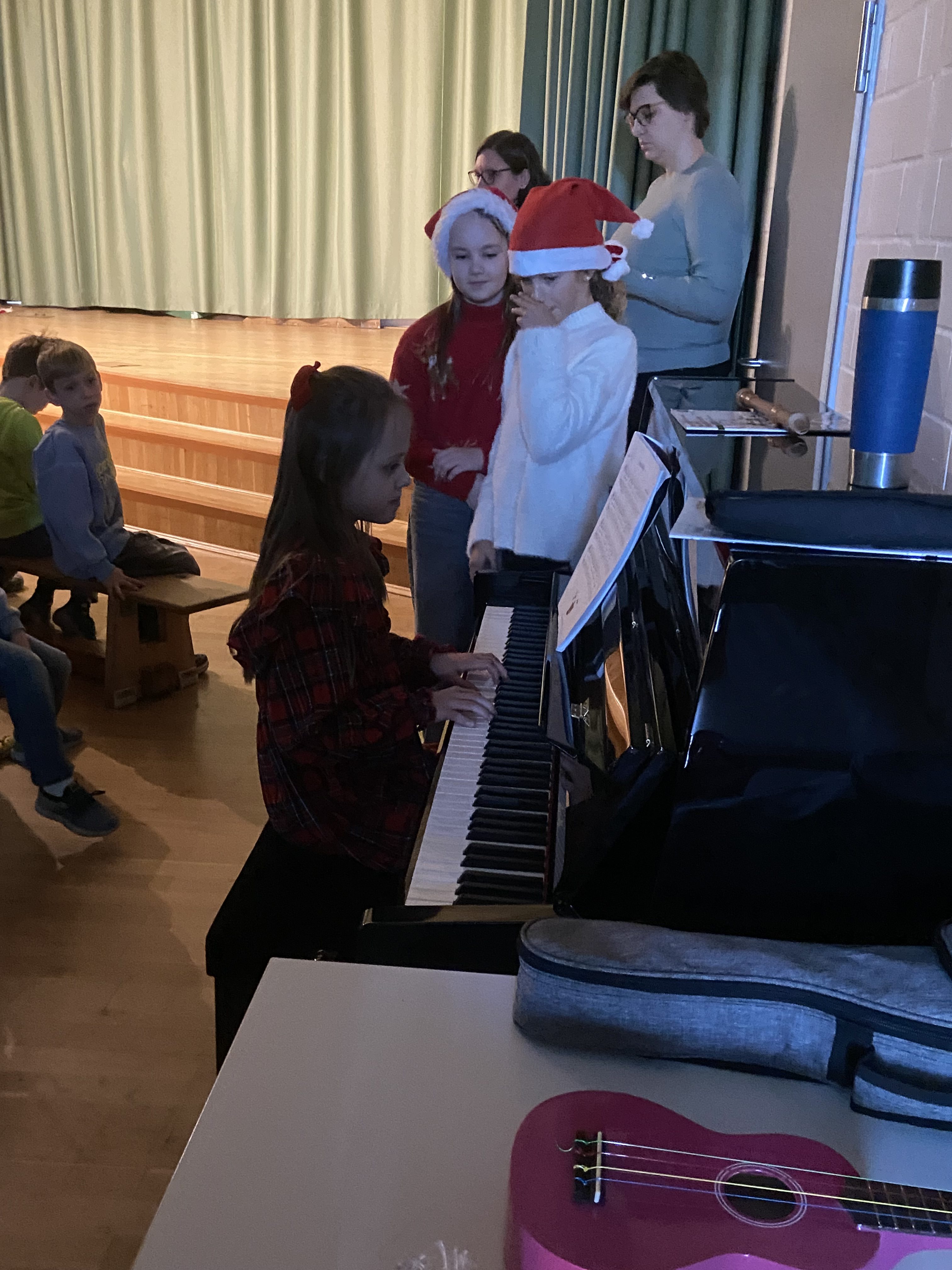 Die Tanz-AG präsentierte einen Line-Dance zu „Last Christmas“. Außerdem wurde das Publikum auf eine wilde Schlittenfahrt mitgenommen in Form von Bodypercussion. Ein Mini-Theaterstück, ein Klatschvers und verschiedene Gedichte wurden aufgeführt. Die Schülerinnen und Schüler der GS Oldau zeigten aber auch ihr Können auf den Instrumenten: Die 4a spielte „Es ist da, unser Christuskind“ auf Ukulelen. Die 3a und die 3b führten jeweils einen Mitspielsatz auf mit diversen Instrumenten. Einige Kinder führten außerdem ihr Können auf verschiedenen Instrumenten wie Klavier, Geige, Akkordeon und Blockflöte vor.
