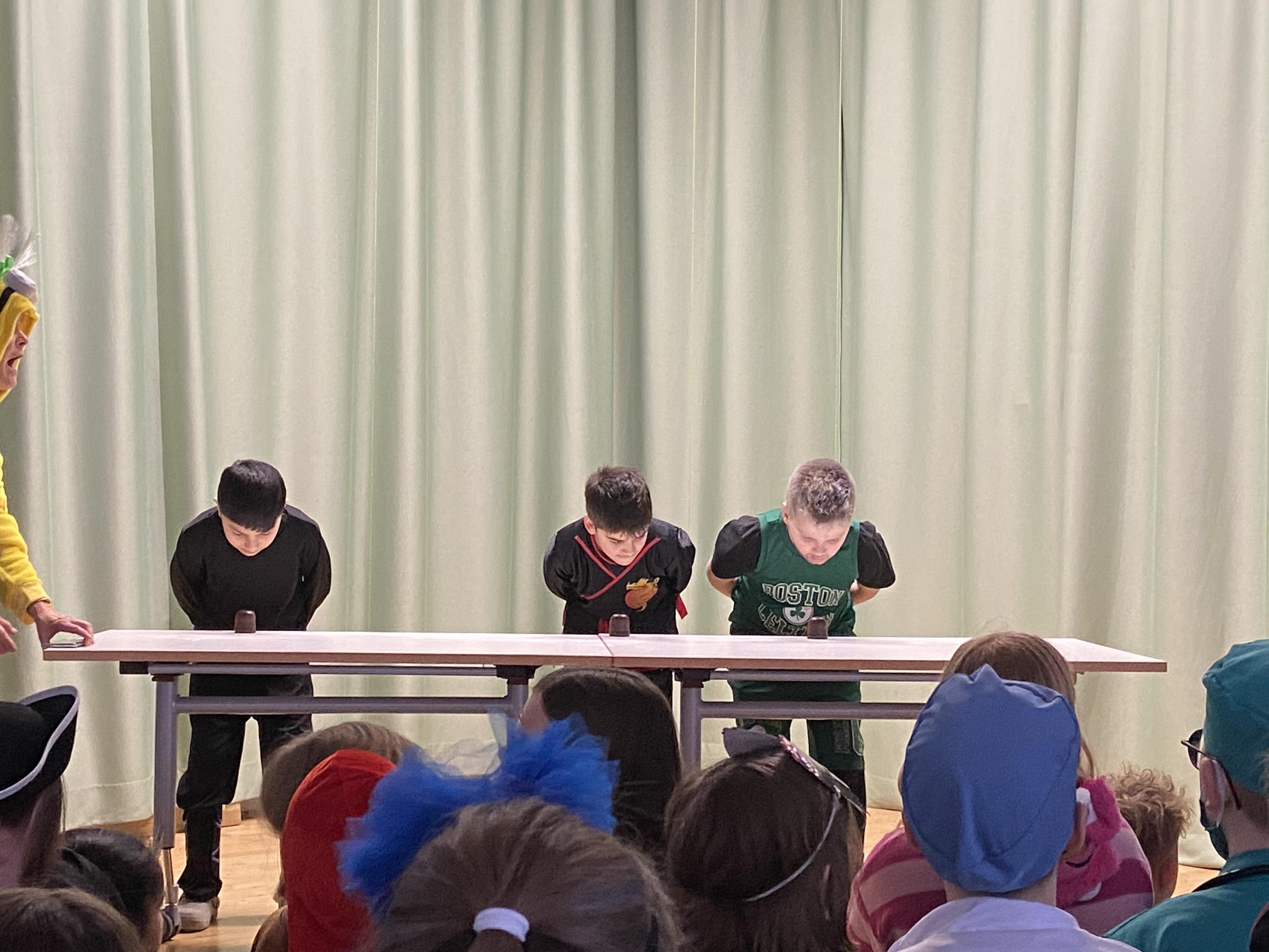 In der 3. und 4. Stunde wurde eine Polonaise der Klassen durch die Schule gestartet, die dann in der Aula endete, wo sich die gesamte Schulgemeinschaft versammelte. Dort traten die Klassensiegerinnen und -sieger des Schokokuss-Wettessens noch einmal gegeneinander an, um zuerst die Jahrgangssieger/innen und anschließend den Schulsieger zu küren. Unter großem Applaus und lautstarker Unterstützung wurde mitgefiebert – das war ein Riesenspaß für alle!